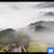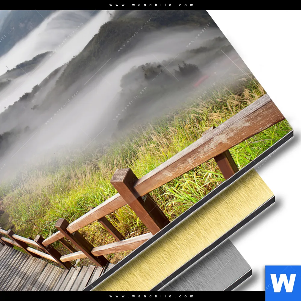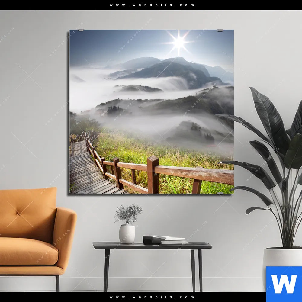 Alu-Dibond Bild | Holztreppe auf Berg mit Wolken | Quadrat