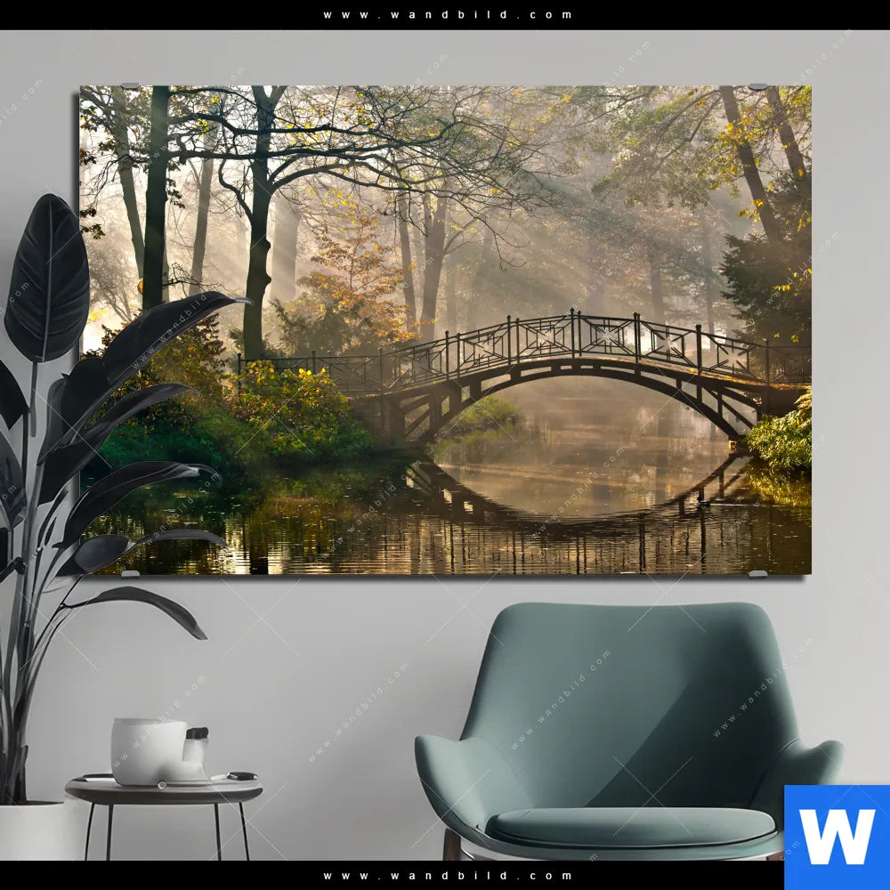 Alu-Dibond Bild | Idyllischer Wald mit Brücke | Querformat