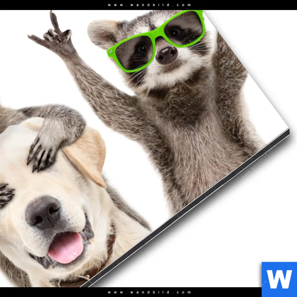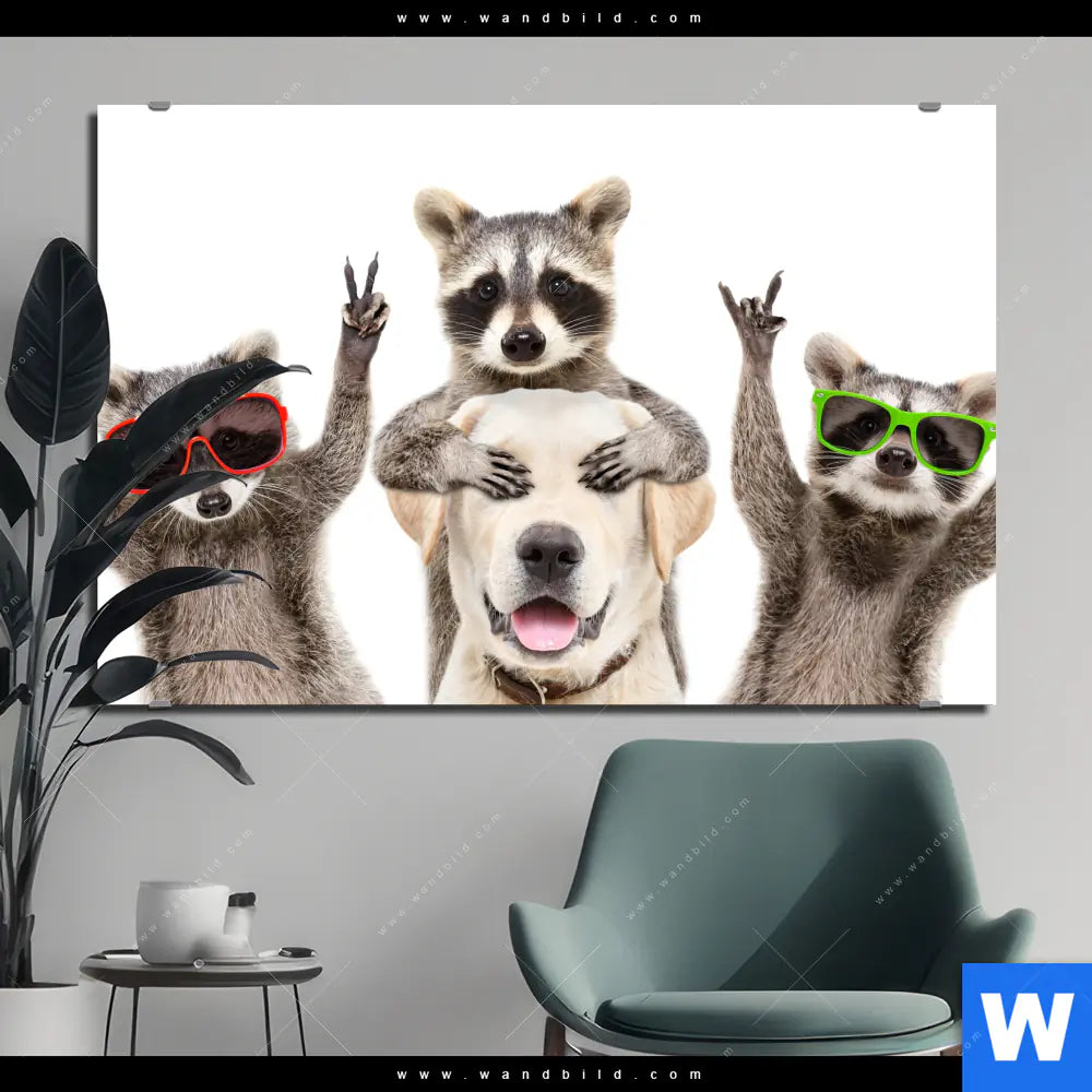 Alu-Dibond Bild | Lustige Waschbären mit Hund | Querformat