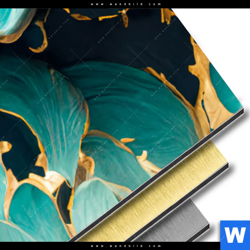 Alu-Dibond Bild | Marmor Blüten in türkis & gold | Panorama