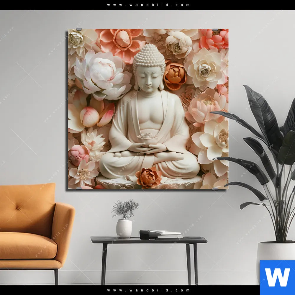 Alu-Dibond Bild | Meditierender Buddha mit Blüten | Quadrat