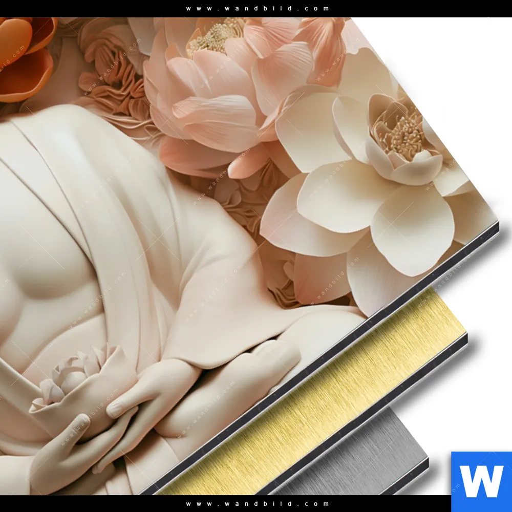 Alu-Dibond Bild | Meditierender Buddha mit Blüten | Querformat