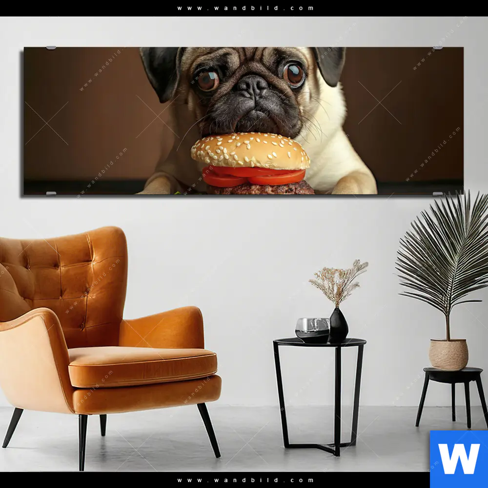 Alu-Dibond Bild | Mops mit Cheeseburger | Panorama