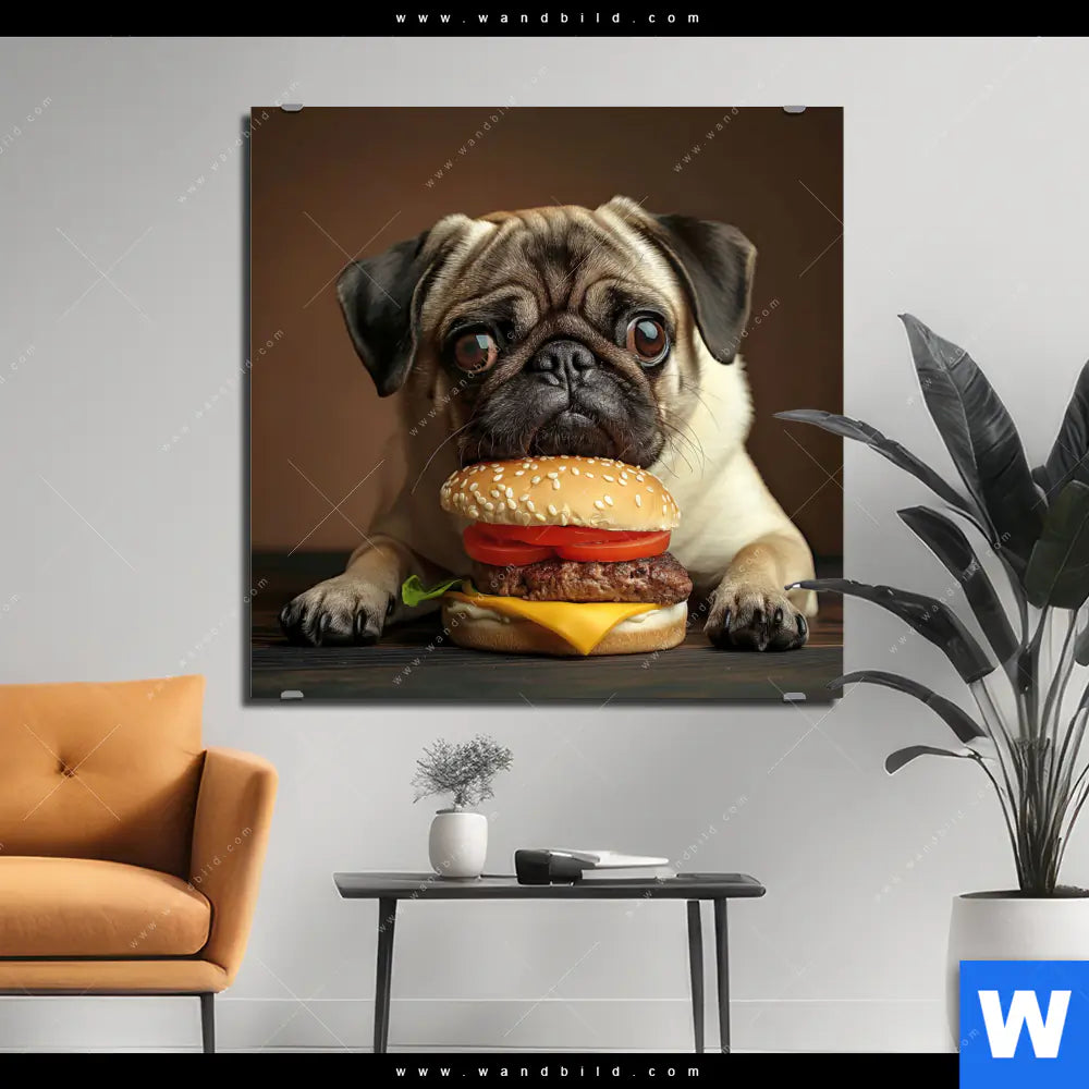 Alu-Dibond Bild | Mops mit Cheeseburger | Quadrat