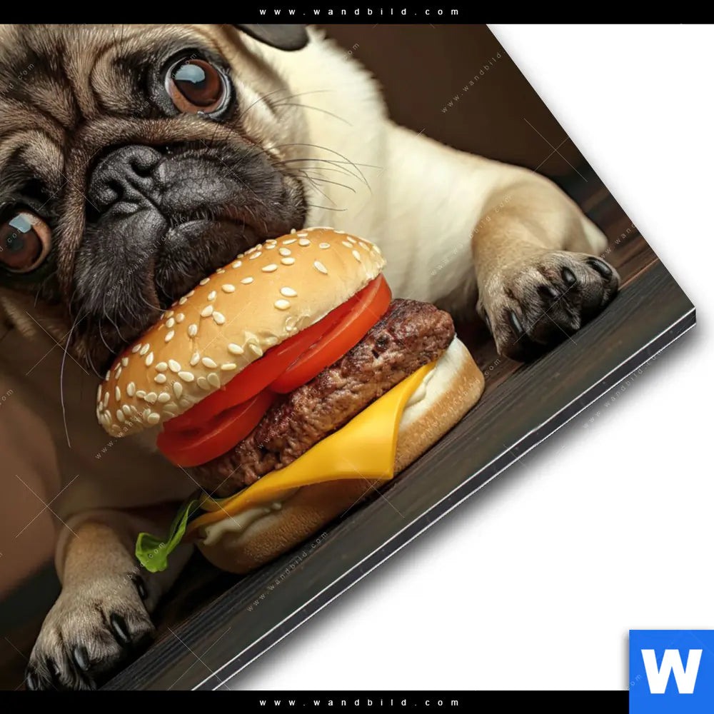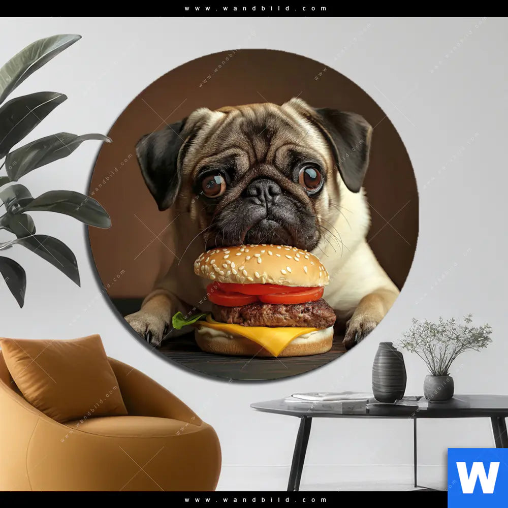 Alu-Dibond Bild | Mops mit Cheeseburger | Rund