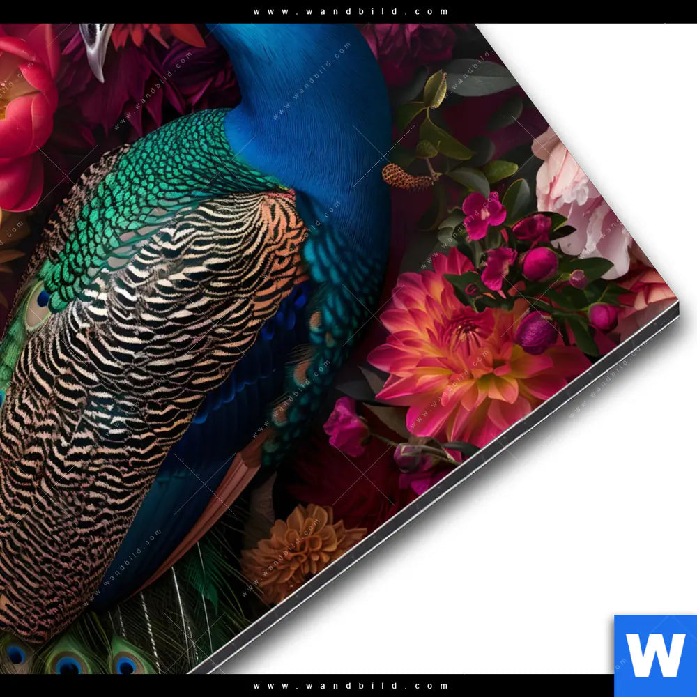 Alu-Dibond Bild | Prachtvoller Pfau und Blüten | Quadrat