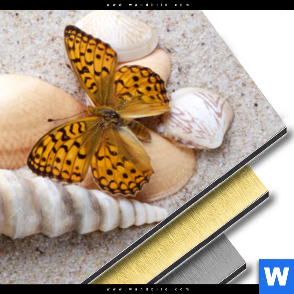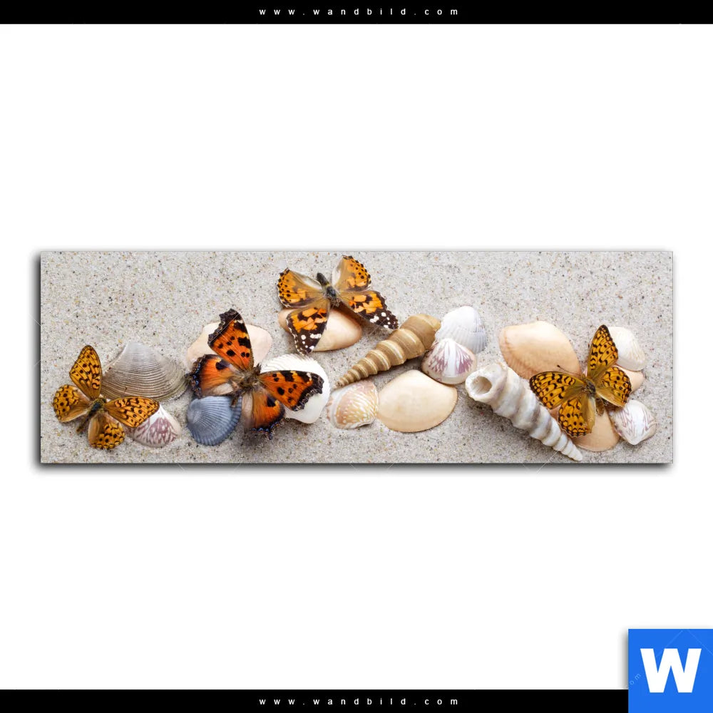 Alu-Dibond Bild | Schmetterlinge & Muscheln im Sand | Panorama