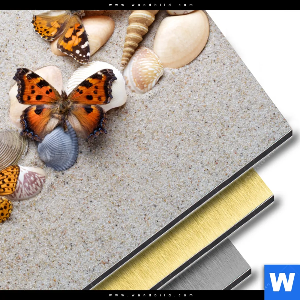 Alu-Dibond Bild | Schmetterlinge & Muscheln im Sand | Quadrat