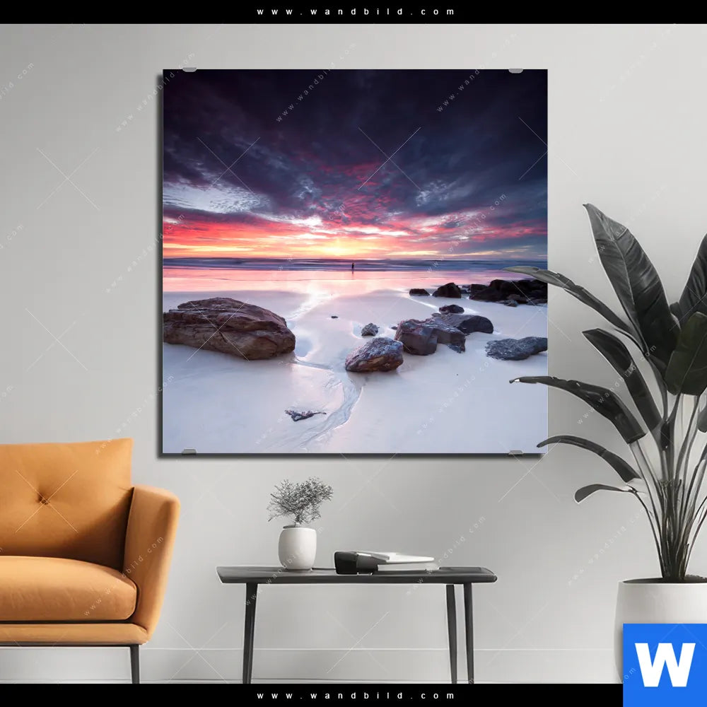 Alu-Dibond Bild | Sonnenaufgang am Strand mit Felsen | Quadrat