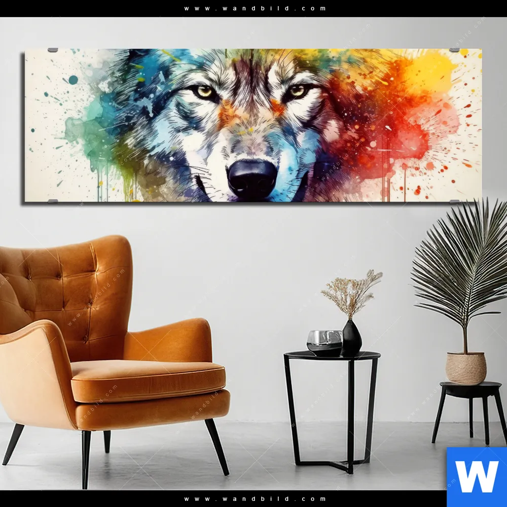 Alu-Dibond Bild | Wolf mit bunten Farbspritzern No. 2 | Panorama