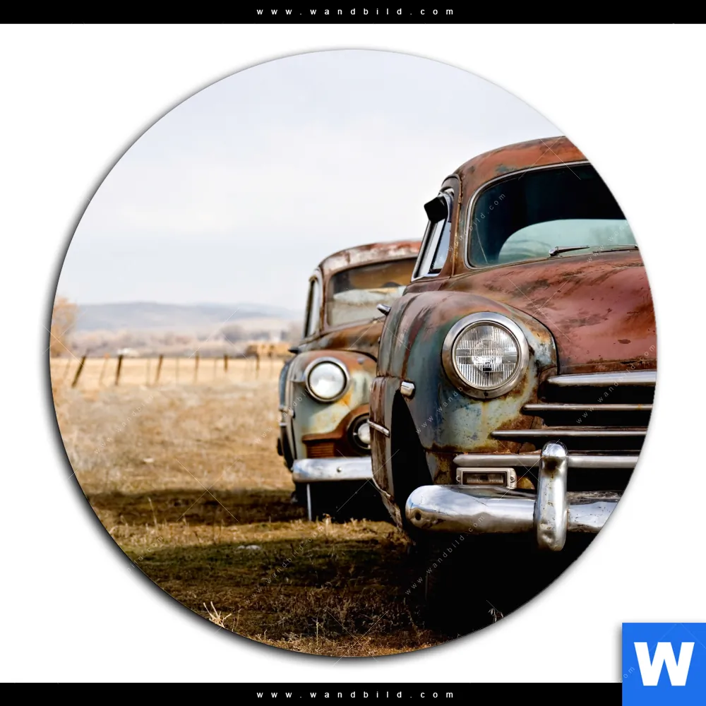 Aluminiumbild gebürstet | Alte rostige Autos | Rund