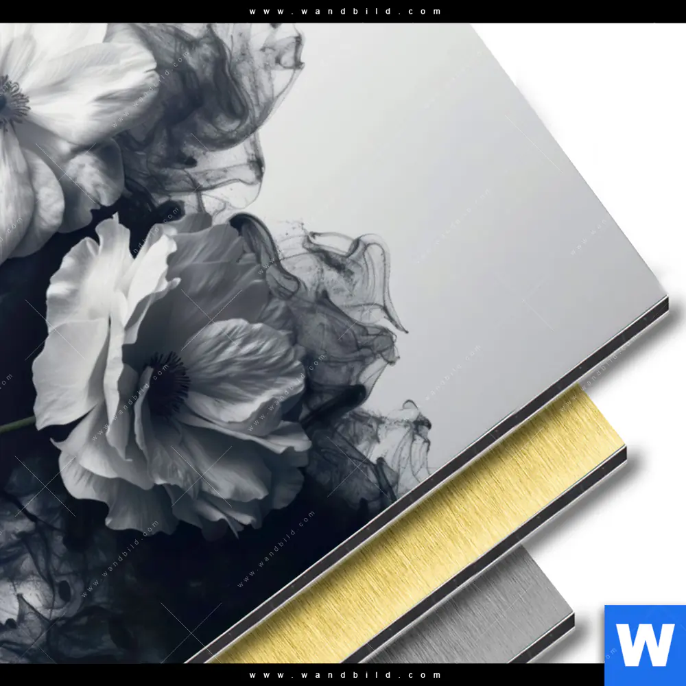 Aluminiumbild gebürstet | Blumen im schwarzen Farbnebel | Querformat