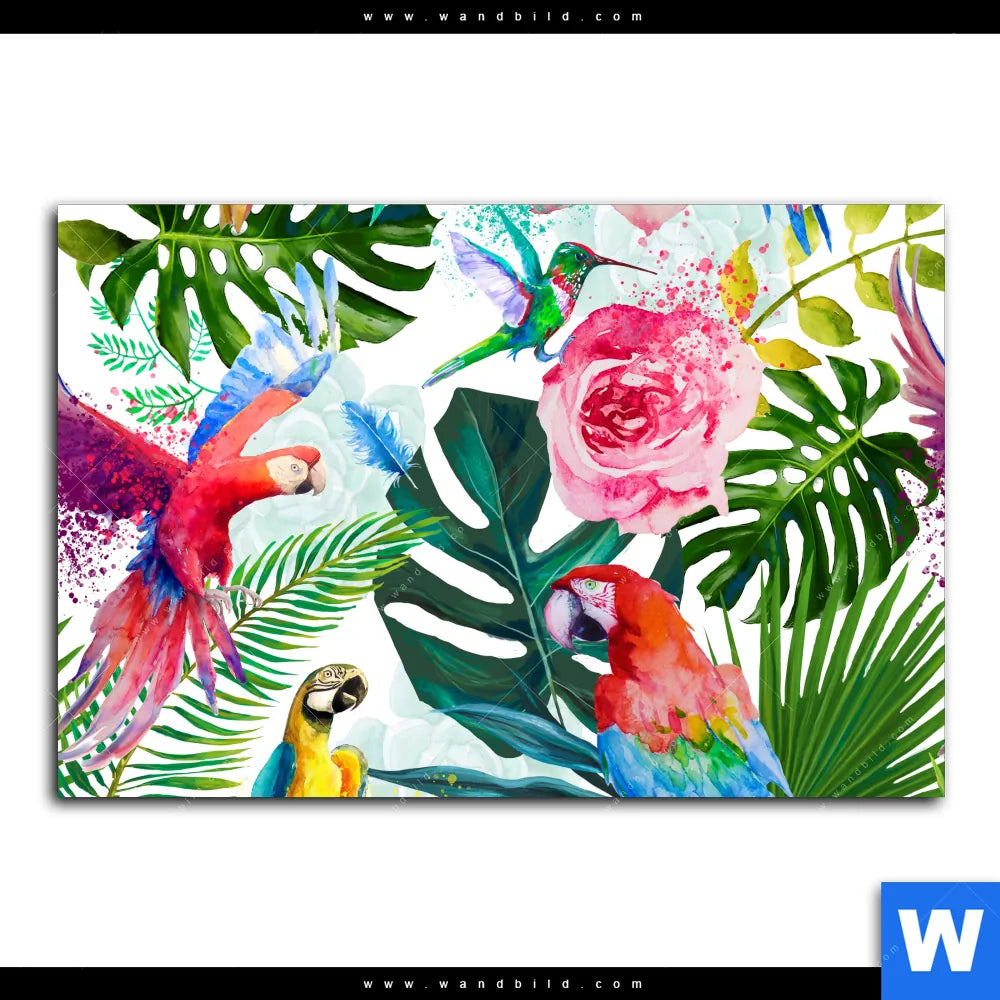 Aluminiumbild gebürstet | Blumen & Papageien Aquarell | Querformat