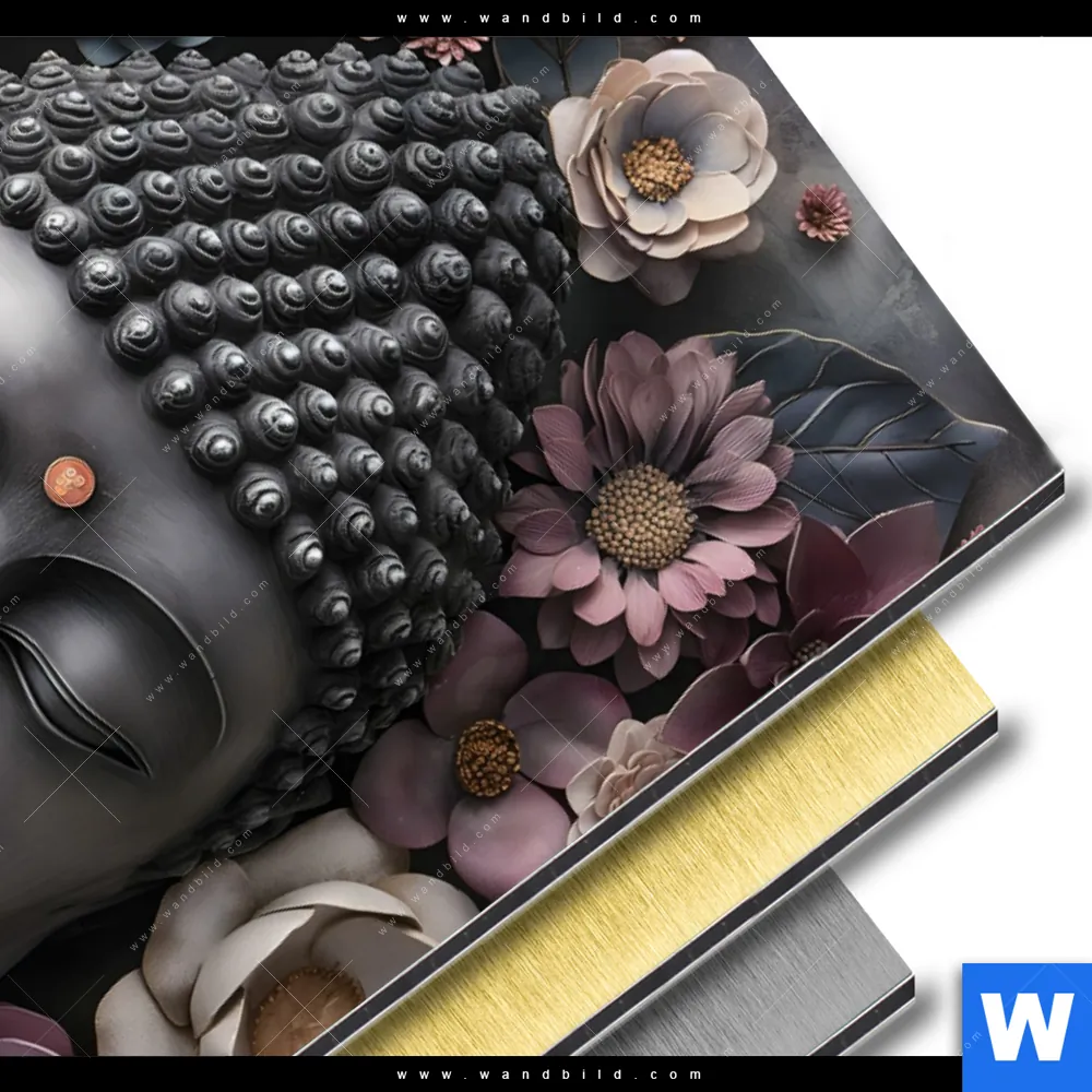 Buddha - Feng Shui, Blumen - Botanik Aluminiumbild mit metallischem Effekt inkl. vormontiertem Rückrahmen