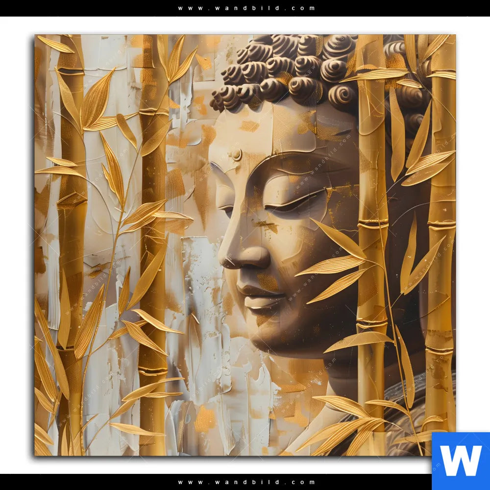 Aluminiumbild gebürstet | Buddha-Statue im goldenen Bambus | Quadrat