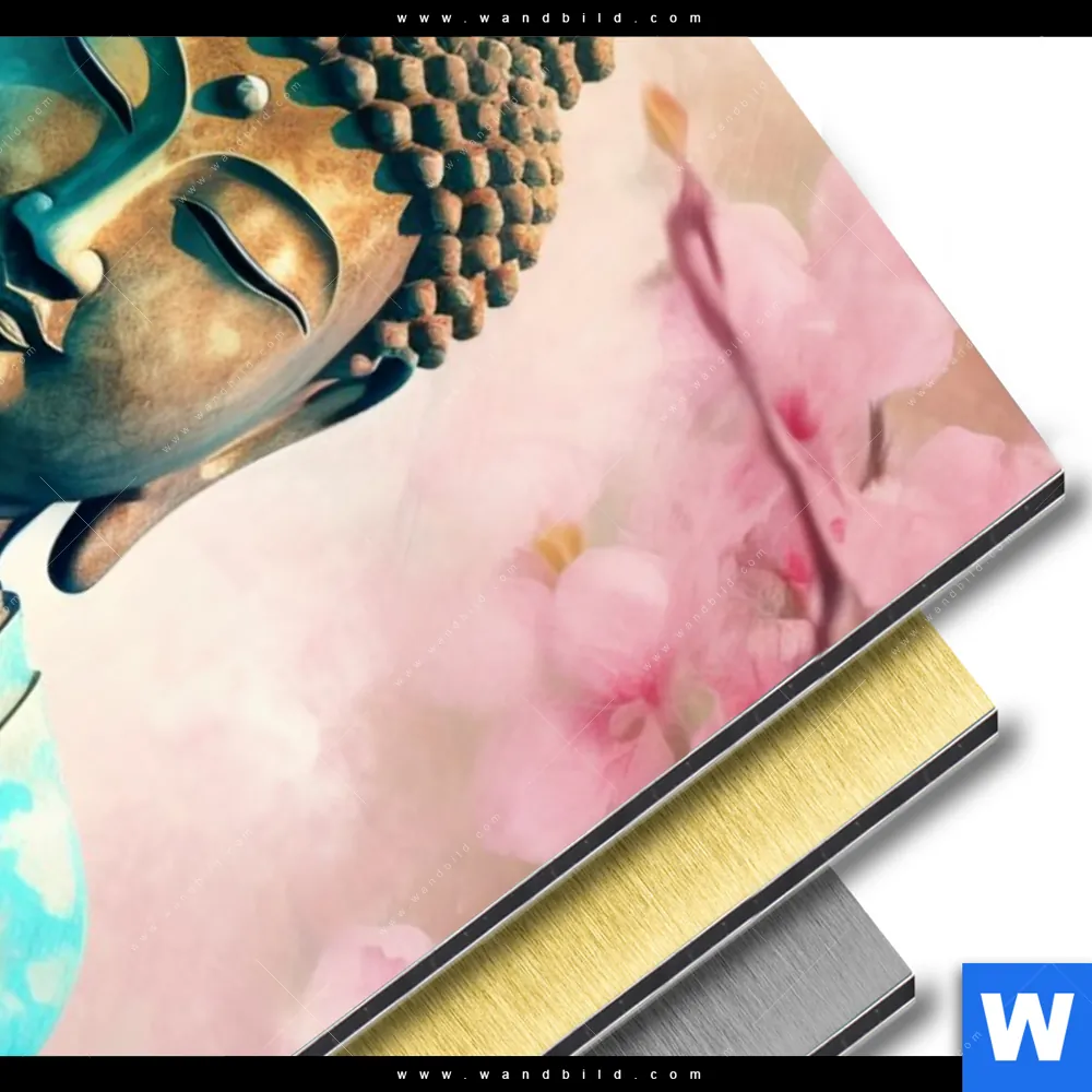 Buddha - Feng Shui, Blumen - Botanik Aluminiumbild mit metallischem Effekt inkl. vormontiertem Rückrahmen