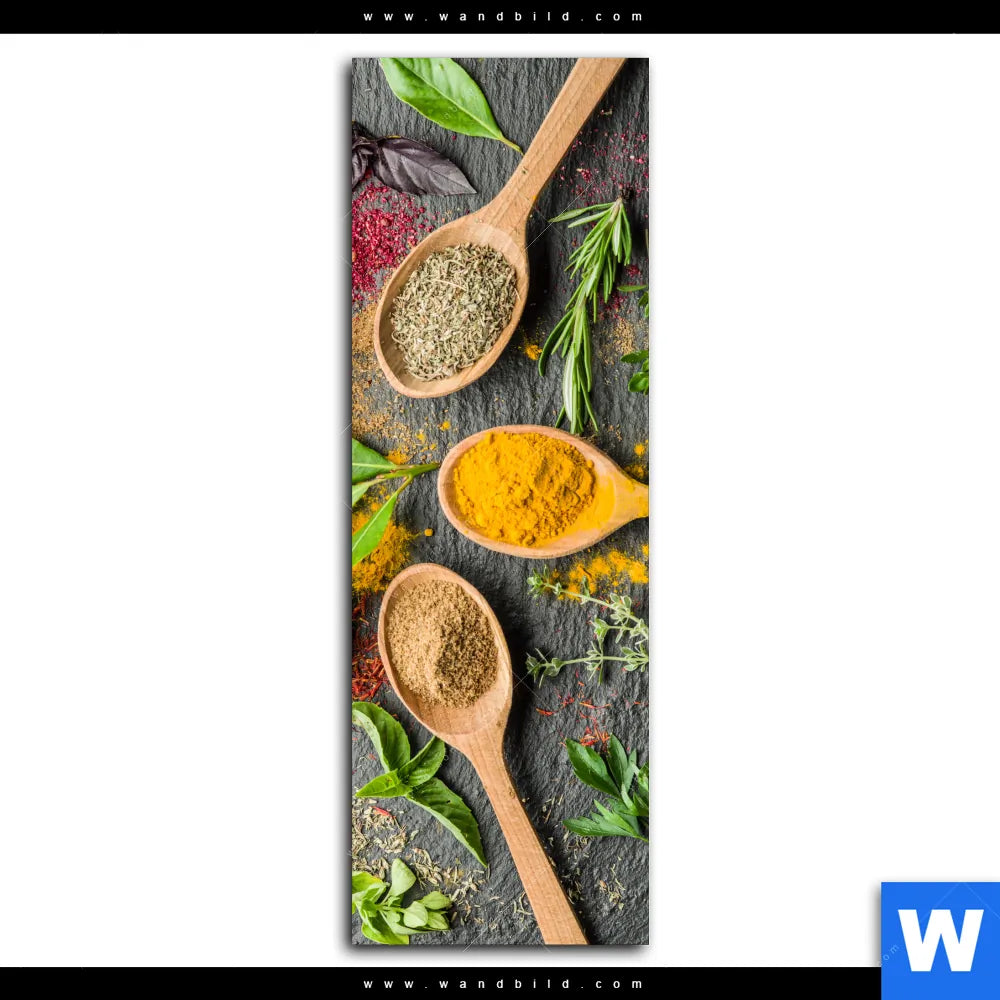 Aluminiumbild gebürstet | Bunte Gewürze in Holzlöffeln | Schmal