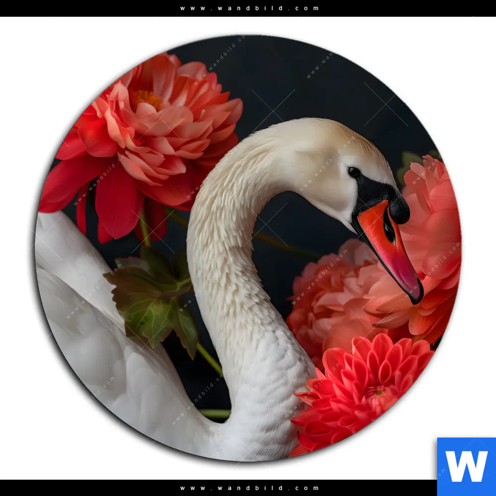 Aluminiumbild gebürstet | Eleganter Schwan mit Blumen | Rund