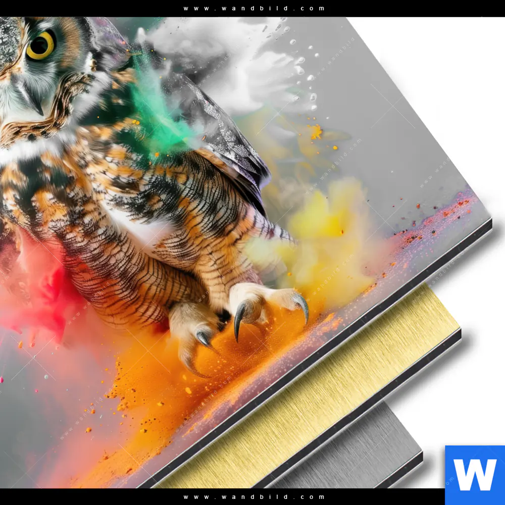 Aluminiumbild gebürstet | Farbenexplosion mit Eule | Quadrat