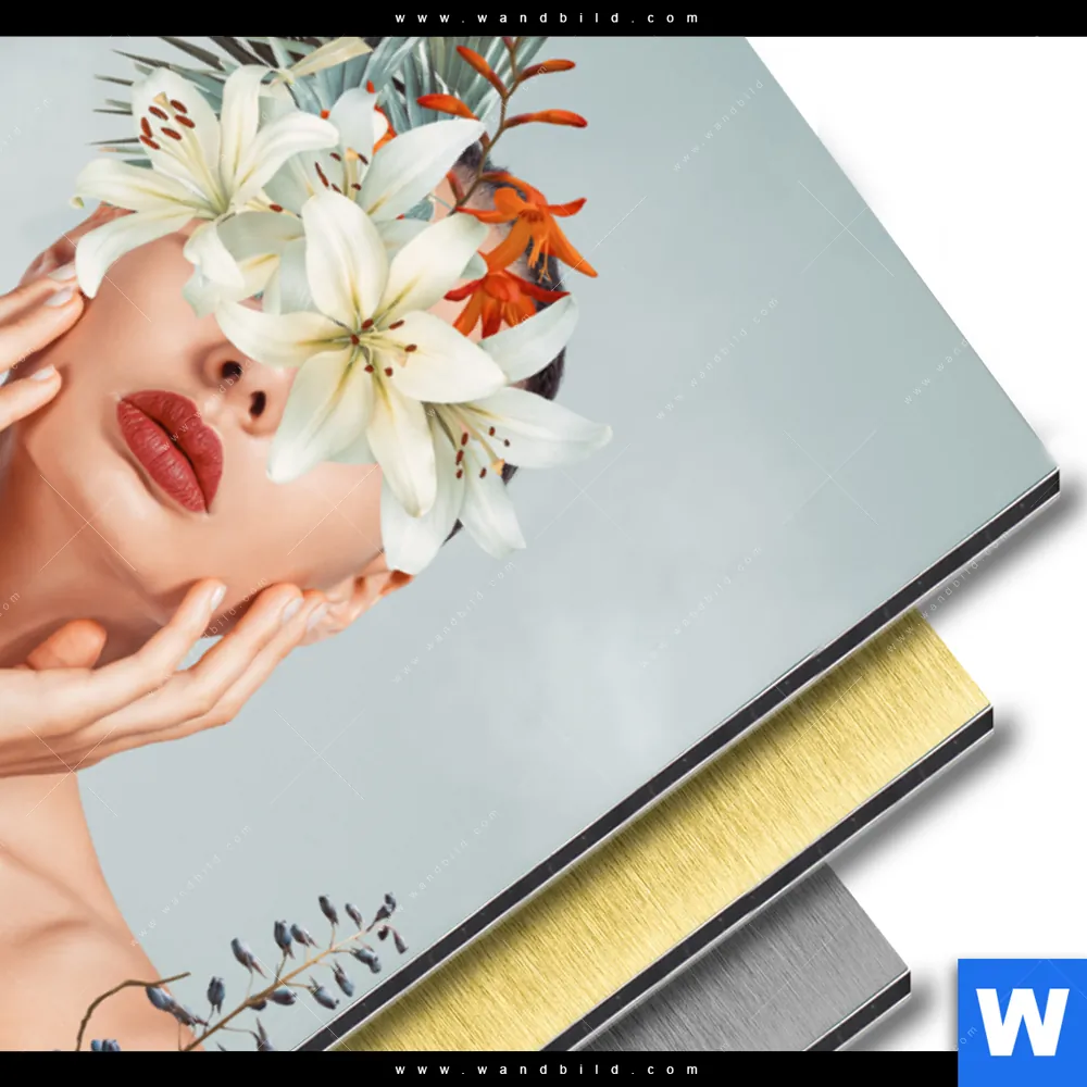 Aluminiumbild gebürstet | Frauenportrait mit Blumen | Hochformat