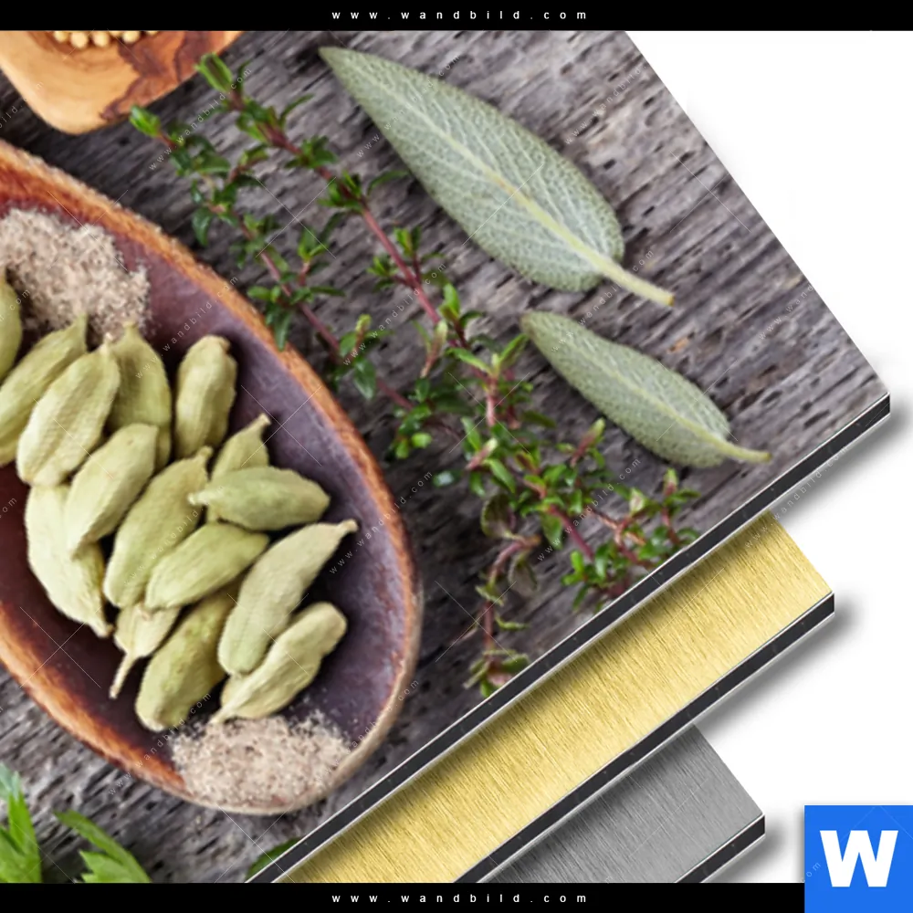 Aluminiumbild gebürstet | Gewürze auf Holzlöffeln | Panorama