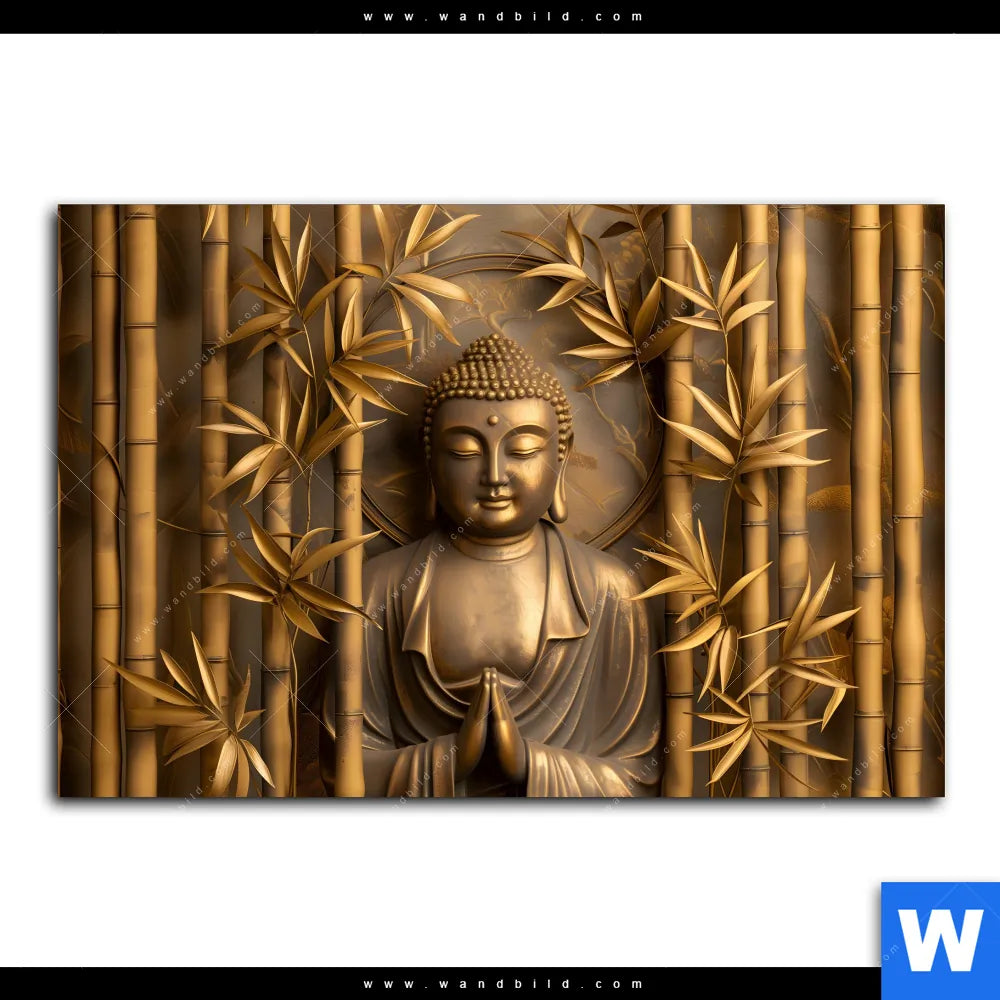 Aluminiumbild gebürstet | Goldener Buddha im Bambuswald | Querformat
