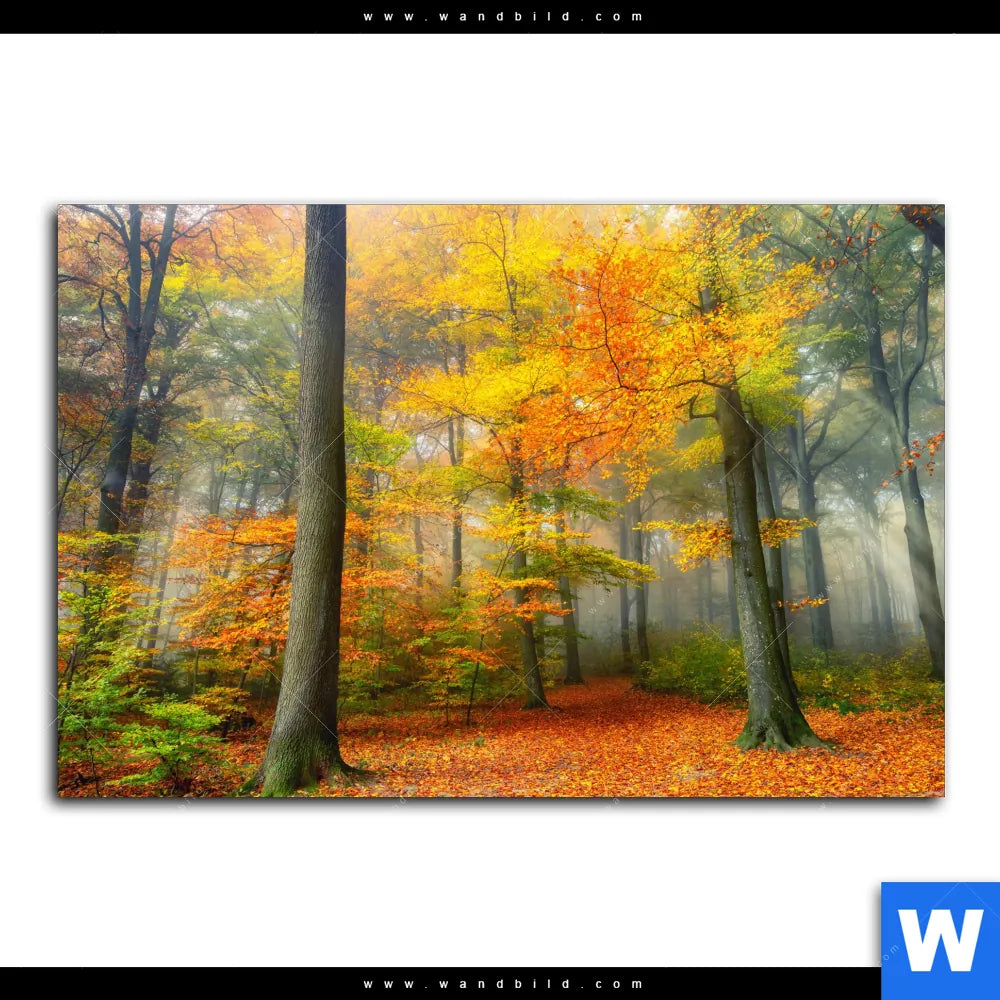 Aluminiumbild gebürstet | Herbstfarben im nebligen Wald | Querformat