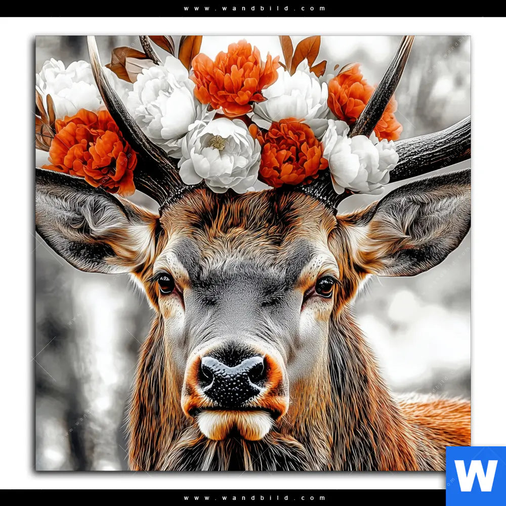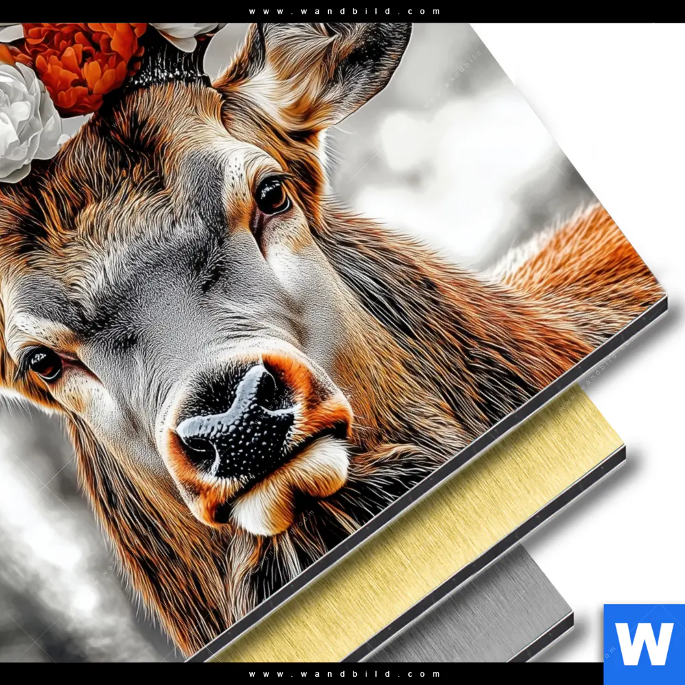 Aluminiumbild gebürstet | Hirsch mit Blumenkrone | Quadrat