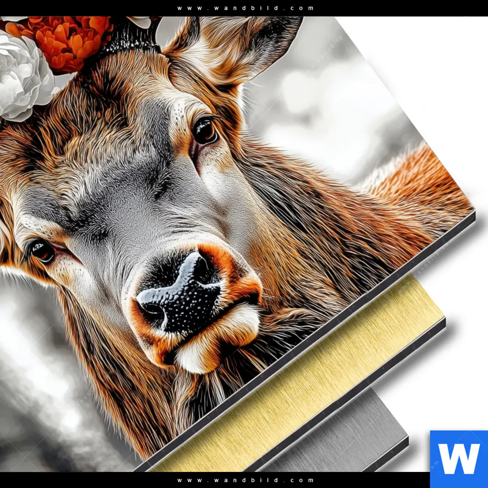 Aluminiumbild gebürstet | Hirsch mit Blumenkrone | Rund