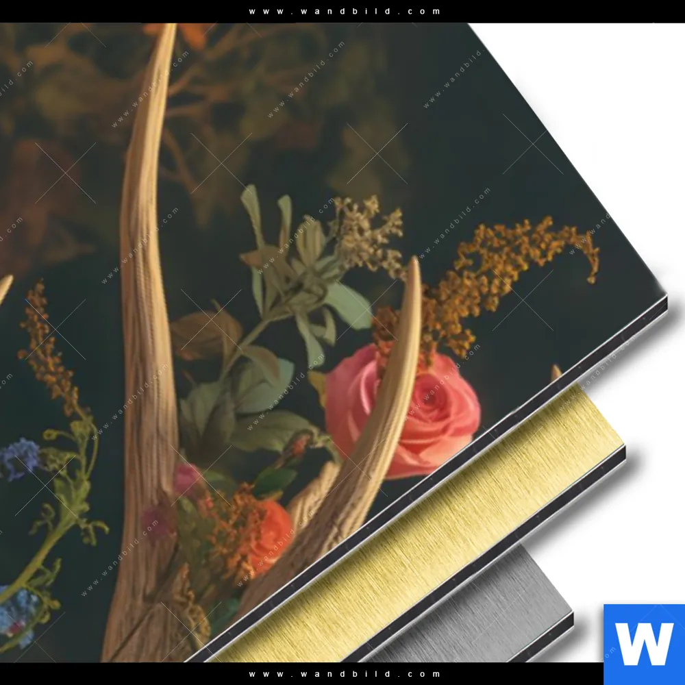 Aluminiumbild gebürstet | Hirsch mit floralem Geweih | Schmal