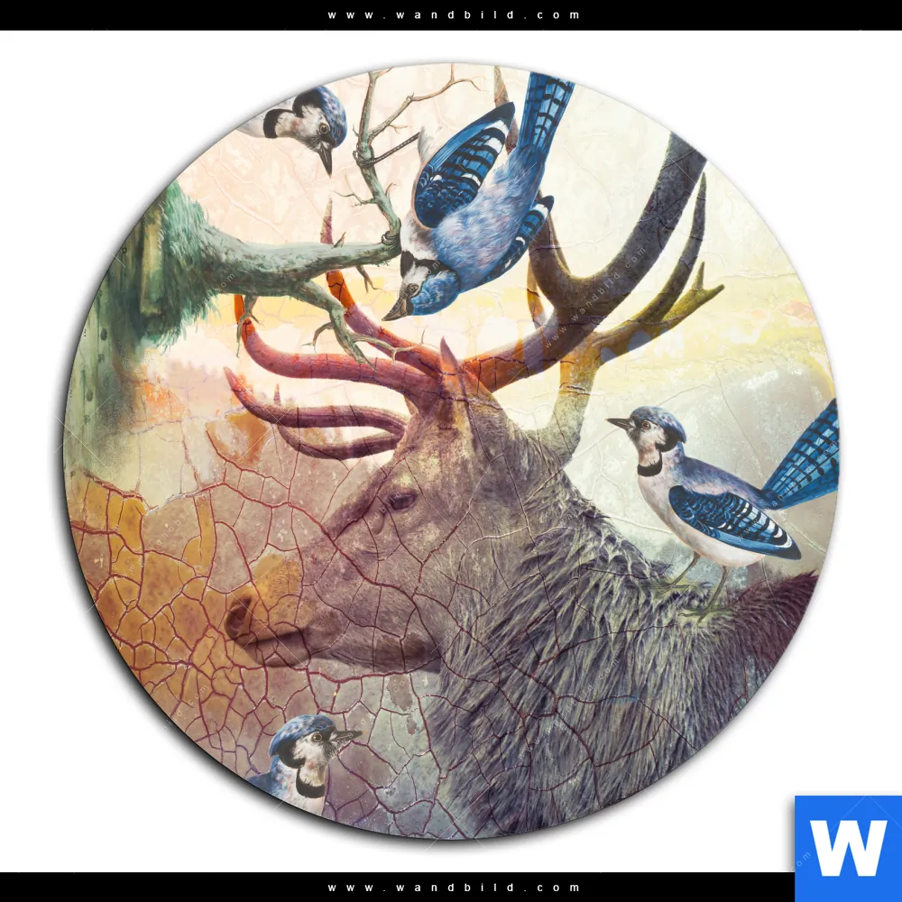 Aluminiumbild gebürstet | Hirsch & Vögel | Rund