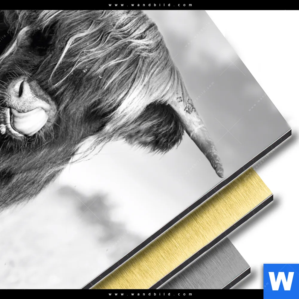 Aluminiumbild gebürstet | Hochlandkuh auf einer Wiese | Hochformat