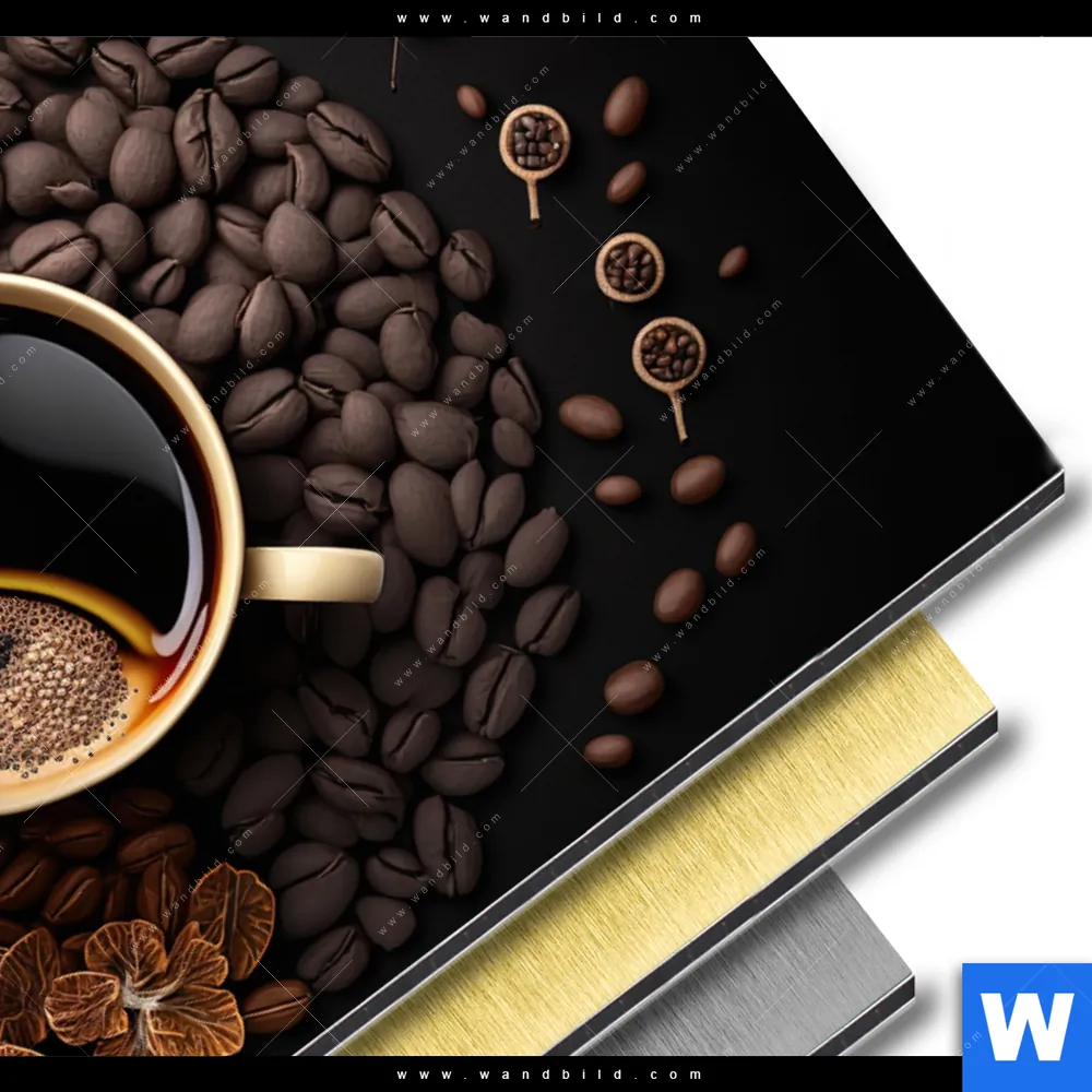 Aluminiumbild gebürstet | Kaffee mit Blattdekoration | Querformat