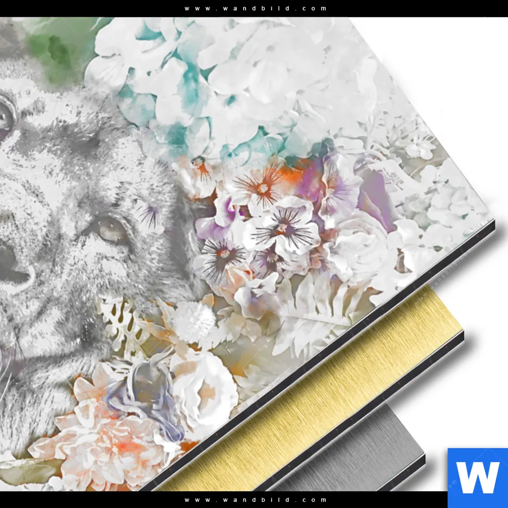 Aluminiumbild gebürstet | Löwe & Blumen | Hochformat