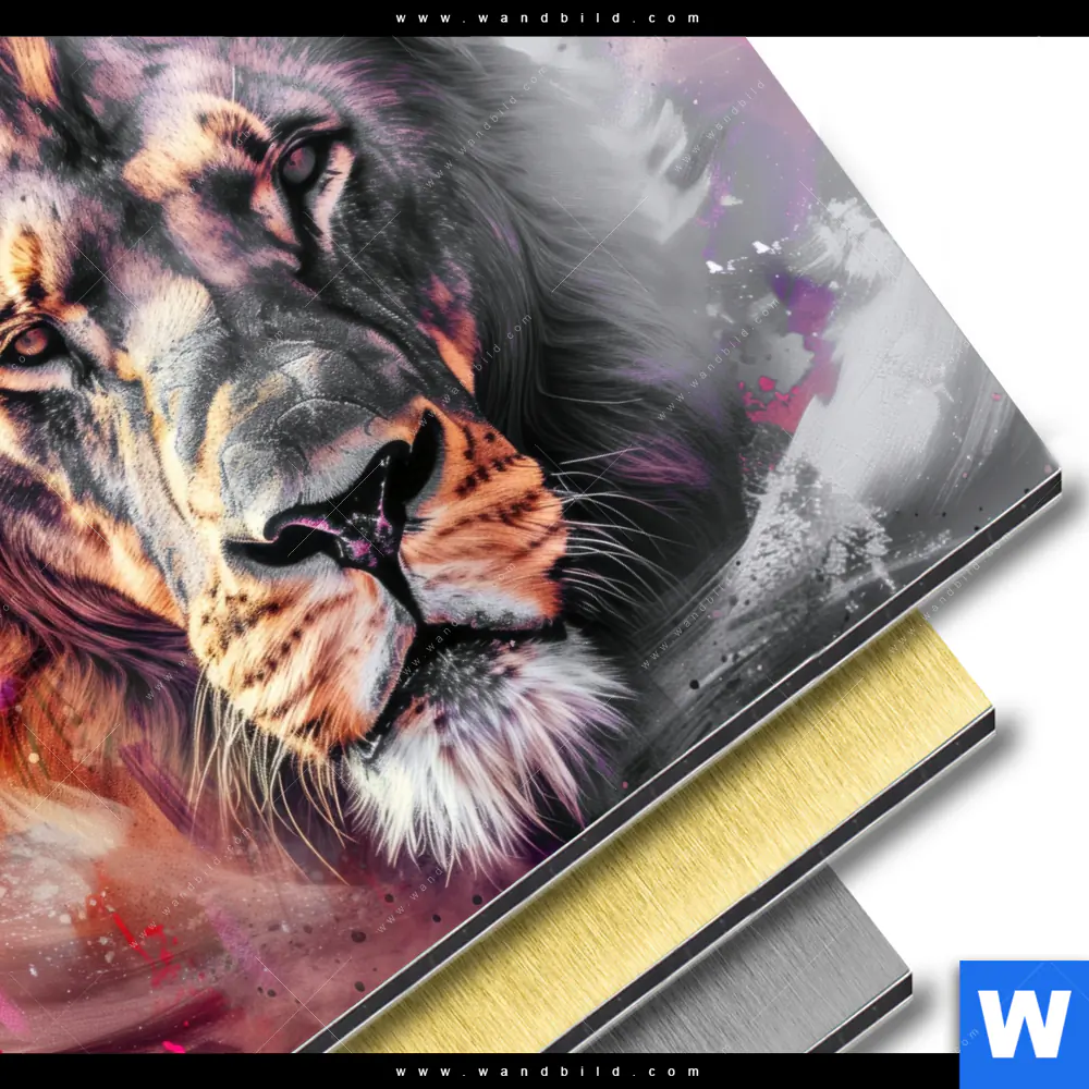 Aluminiumbild gebürstet | Löwe im Farbensturm | Quadrat