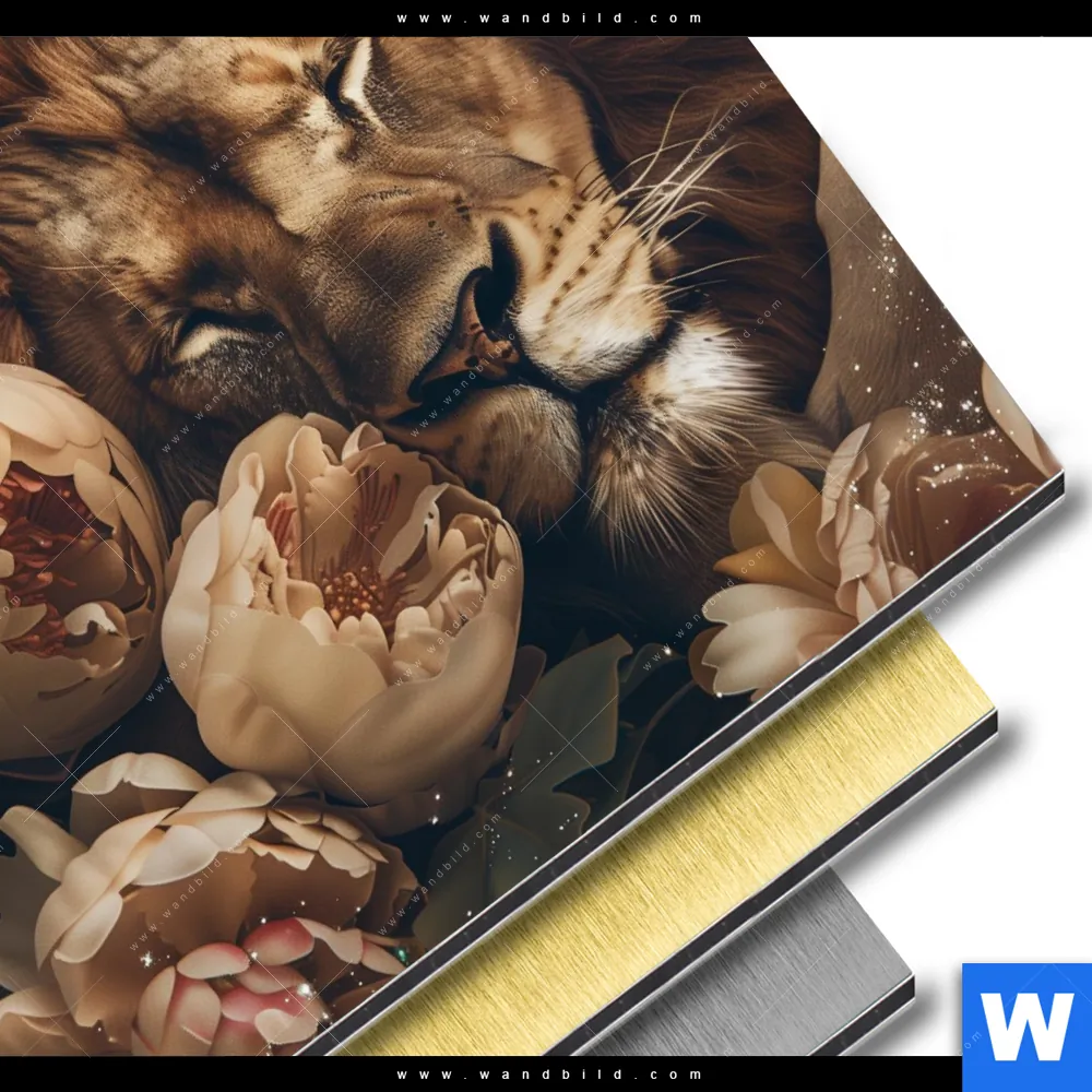 Aluminiumbild gebürstet | Löwe schläft in Blüten | Quadrat