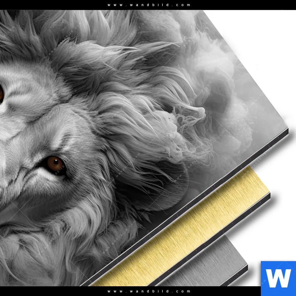 Aluminiumbild gebürstet | Löwengesicht in Rauch | Hochformat