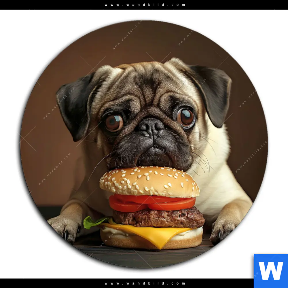 Aluminiumbild gebürstet | Mops mit Cheeseburger | Rund