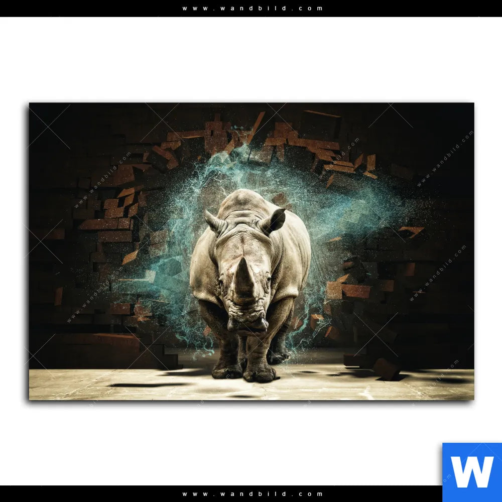 Aluminiumbild gebürstet | Nashorn zerstört Wand | Querformat