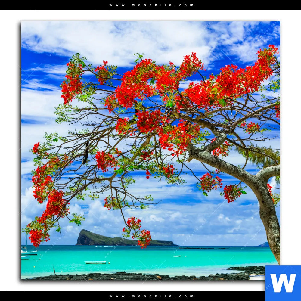 Aluminiumbild gebürstet | Rote Blüten und Türkisfarbenes Meer | Quadrat