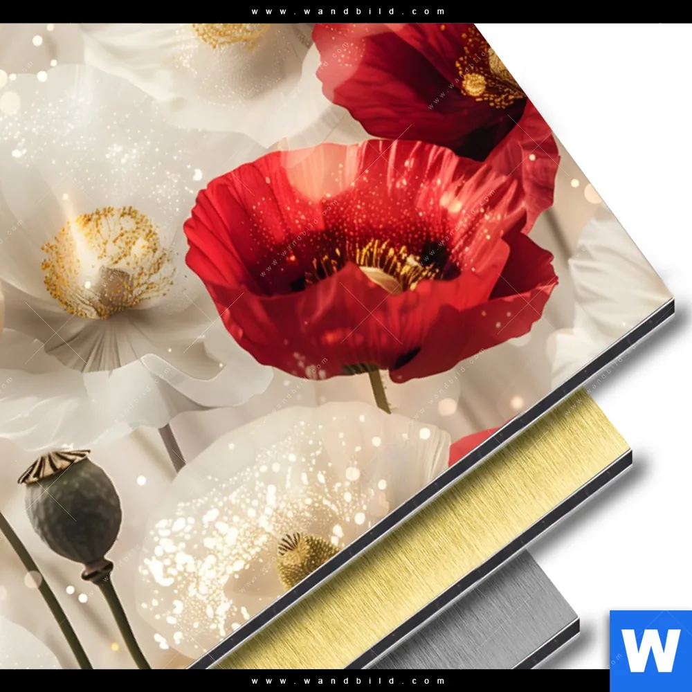 Aluminiumbild gebürstet | Rote und weiße Mohnblumen | Querformat