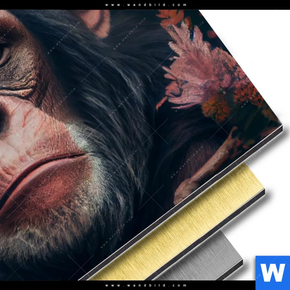 Aluminiumbild gebürstet | Schimpanse zwischen Blumen | Querformat