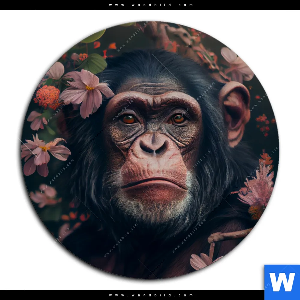 Aluminiumbild gebürstet | Schimpanse zwischen Blumen | Rund