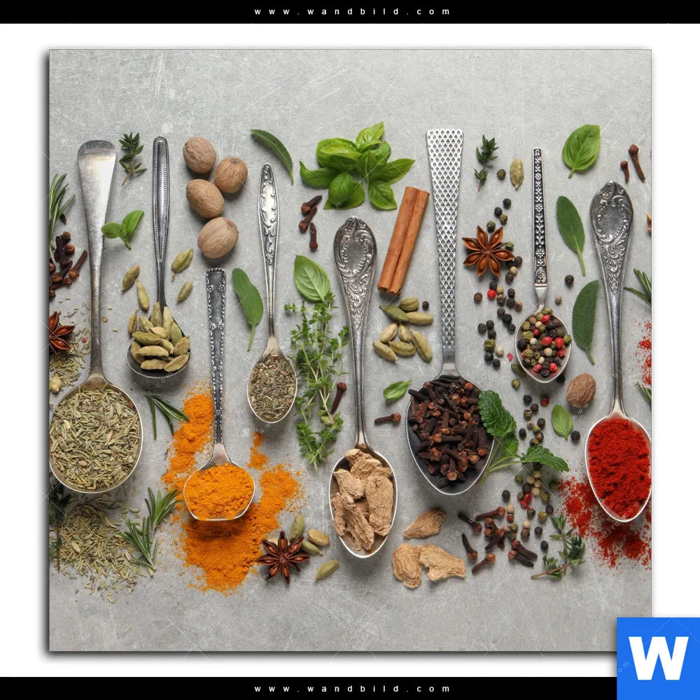 Aluminiumbild gebürstet | Silberlöffel mit Gewürzen | Quadrat