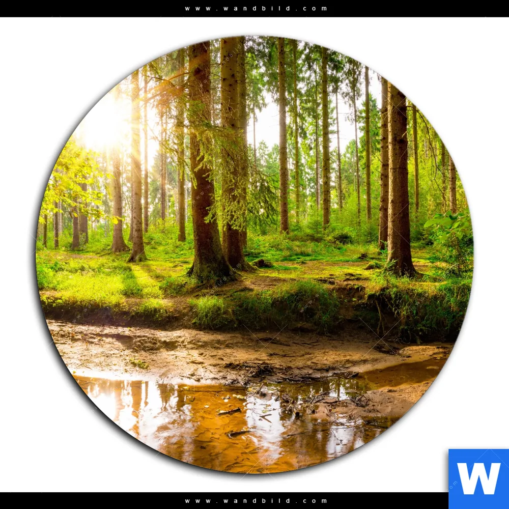 Aluminiumbild gebürstet | Sonne im grünen Wald | Rund