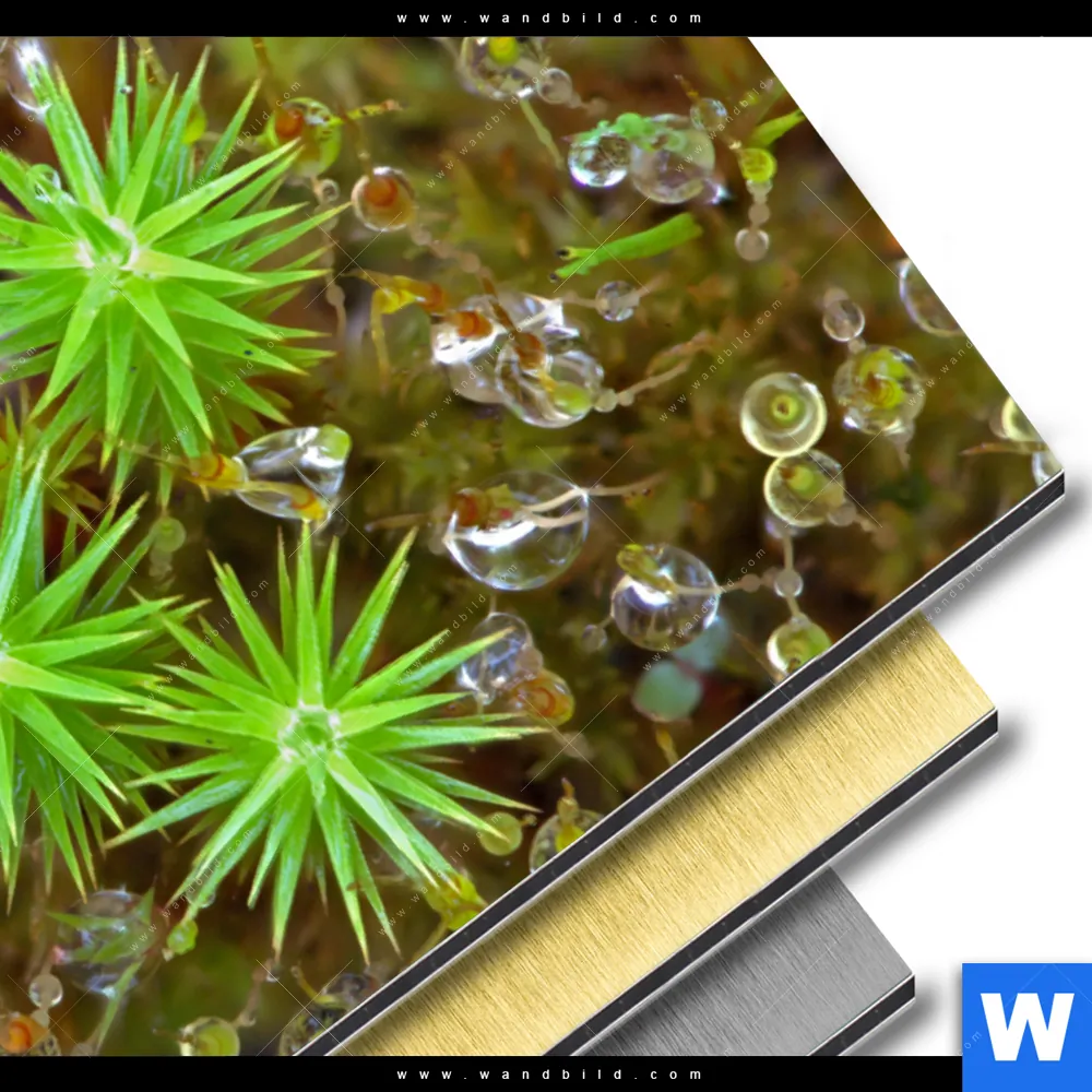 Aluminiumbild gebürstet | Tautropfen auf Moos | Querformat