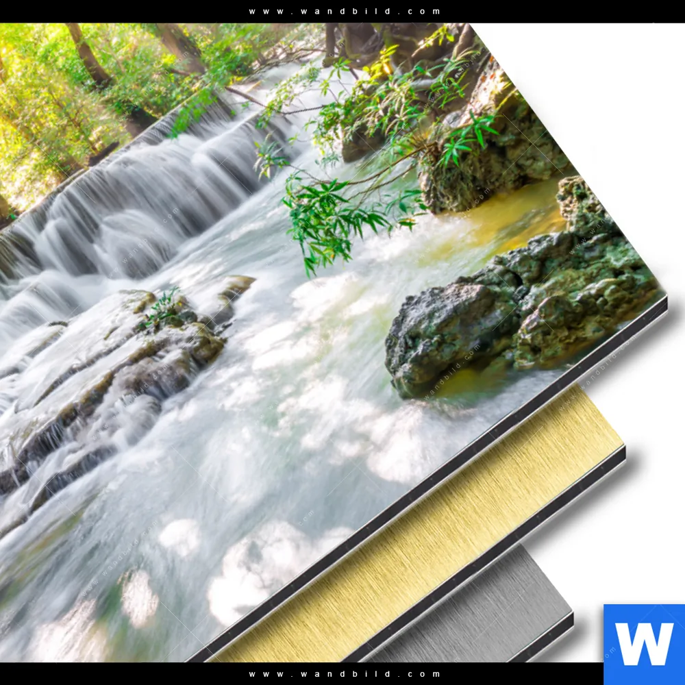 Aluminiumbild gebürstet | Wald & Wasserfall No. 1 | Querformat