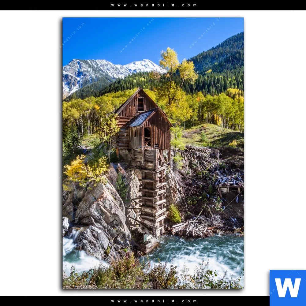 Aluminiumbild gebürstet | Waldhütte am Fluss | Hochformat