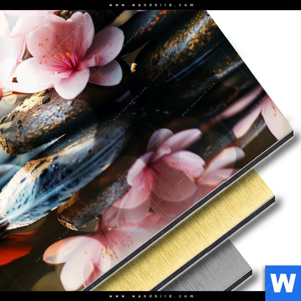 Blumen - Botanik, Buddha - Feng Shui Aluminiumbild mit metallischem Effekt inkl. vormontiertem Rückrahmen