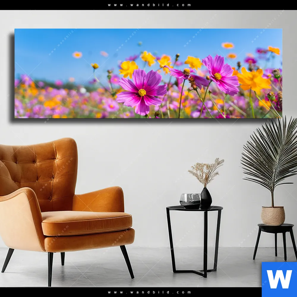 Leinwandbild | Blumenwiese unter blauem Himmel | Panorama